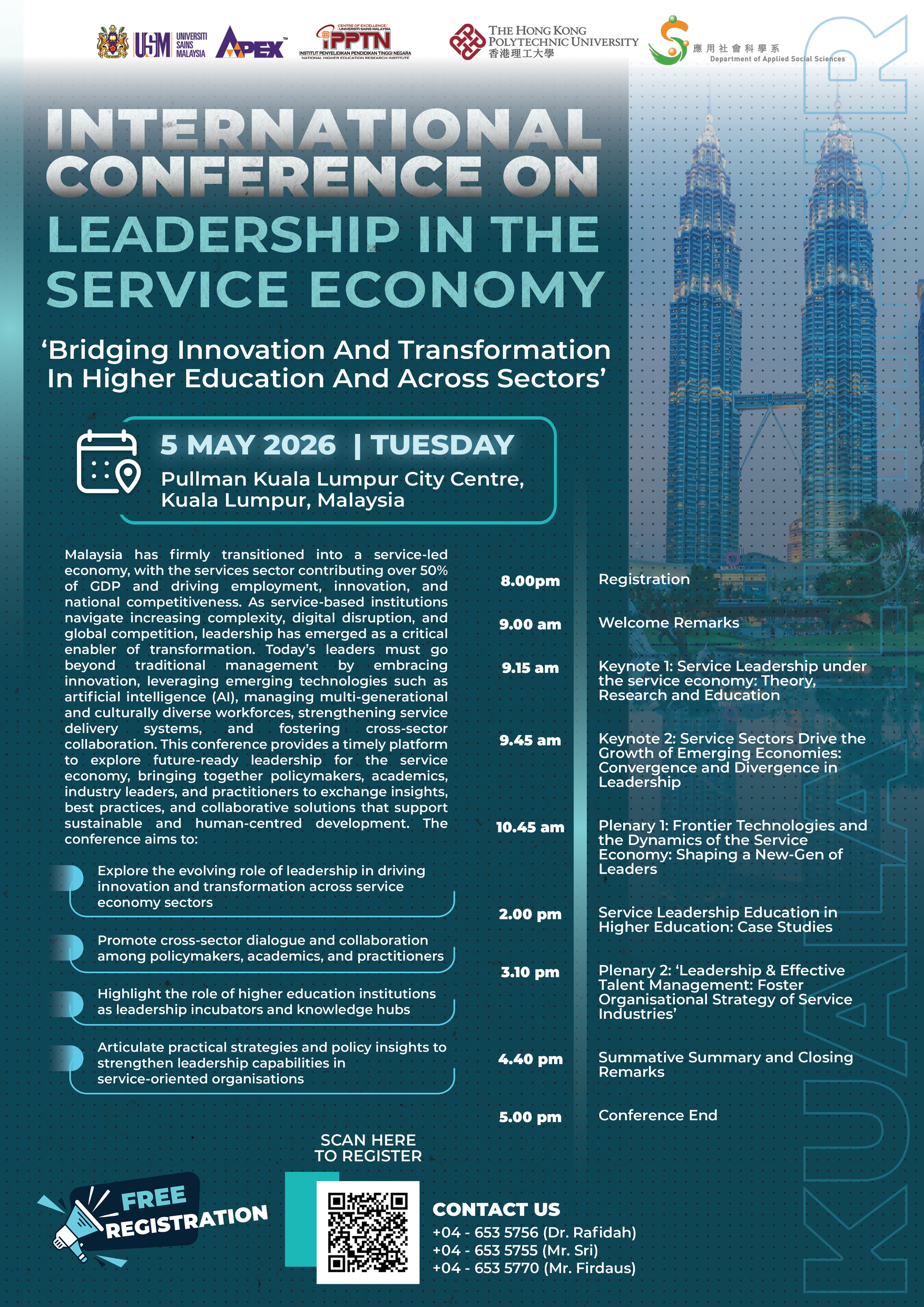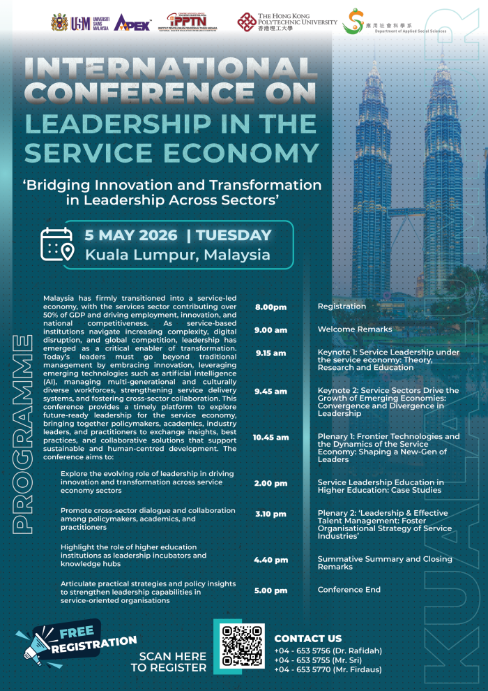This conference provides a timely platform to explore future-ready leadership for the service economy, bringing together policymakers, academics, industry leaders, and practitioners to exchange insights, best practices, and collaborative solutions that support sustainable and human-centred development.
